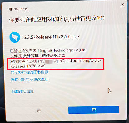 钉钉下载器在下载完之后就自动安装,这个时候用户账户控制会弹出提示,点击显示更多详细信息就会看到程序位置