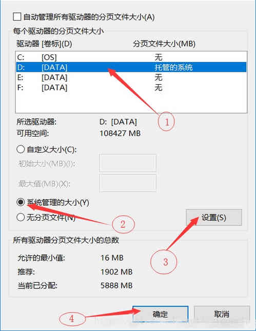 根据自己的情况选择保存虚拟内存的盘符,按下图1234的顺序设置后,重启电脑即可