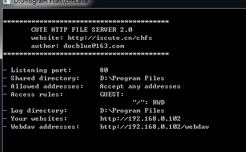 使用方法非常简单,将chfs.exe文件放到你想共享的文件夹下,双击运行即可